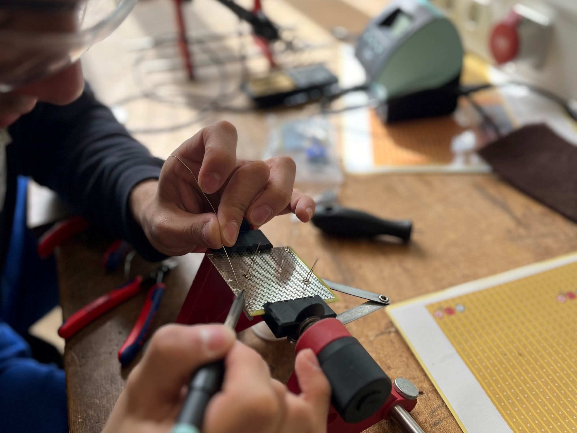 Die Konstruktion einer Wechselschaltungen sowie das Verdrahten von Verlängerungskabeln und das Verlöten von Platinen bereiteten den Jugendlichen kaum Schwierigkeiten, stattdessen sogar jede Menge Spaß.